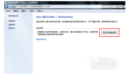 3.然后打开系统还原,即点击图中所示的那个按钮,如果有账户控制则会有所提示,通过即可;