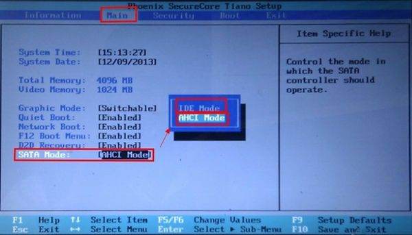 2、用键盘的上下左右键。移动到Main处,再用下键移动到SATAMode:AHCIMode处。选择后,保存更改之后,diskgeniusU盘就能分区了。