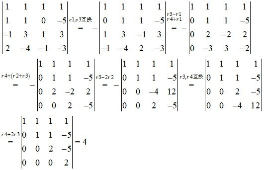 5 0 6 -1。把第一行的1倍、-2倍分别加到第二、三行后按第二列展开得-1*