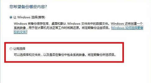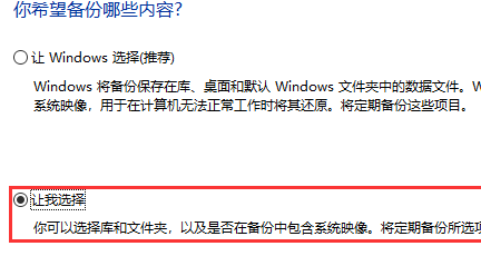 4.启动完成后,进入“设置备份对话框”,在“您希望备份哪些内容”中,选择“让我选择”,然后点击”下一步“。