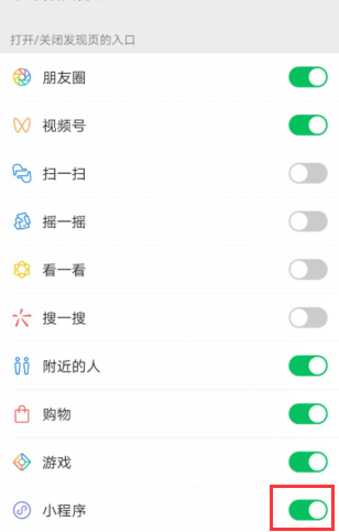 四、在发现页功能列表中找到“小程序”,并点击右边的开关即可添加小程序功能。