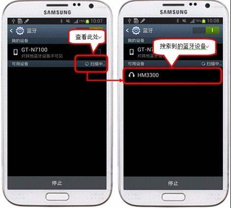 2、开启手机蓝牙功能,将手机蓝牙设置为“所有人可见” 或可被搜索或开放检测,搜索蓝牙设备;