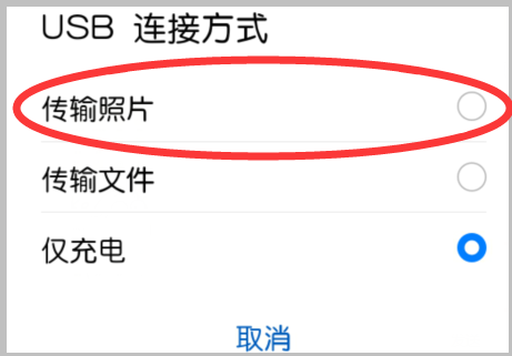 2、在手机中打开的“USB连接方式”的选项中选择“传输照片”。