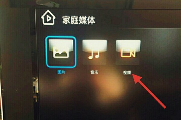 3、会发现电视上出现多媒体选项,有【图片】、【音乐】、【视频】,选择【视频】进入即可。