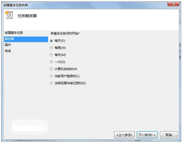 4.希望任务何时开始:只是使用一次,点选“一次”,然后点击“下一步”即可。这里我们选择了默认的“每天”。