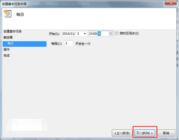 5.依旧是设置晚上11点关机,这里我们修改第二个框中的内容为23:00:00即可,数值可以点选也可以输入。我们还可以在第三个框中更改时间间隔。设置完成后点击“下一步”。