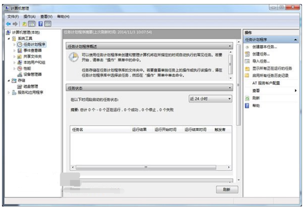 2.左键单击“系统工具”栏下的“任务计划程序”,最后在最右侧的“操作”栏中,点击“创建基本任务”。