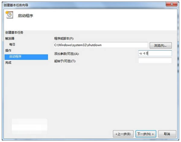 7.进入“启动程序”项,如果系统在C盘,那么在“程序或脚本”框内输入“C:\Windows\system32\shutdown.exe”(注意根据个人实际情况修改盘符);然后在“参数”处填入“-s -t 0”(即立即关机),然后点击“下一步”。