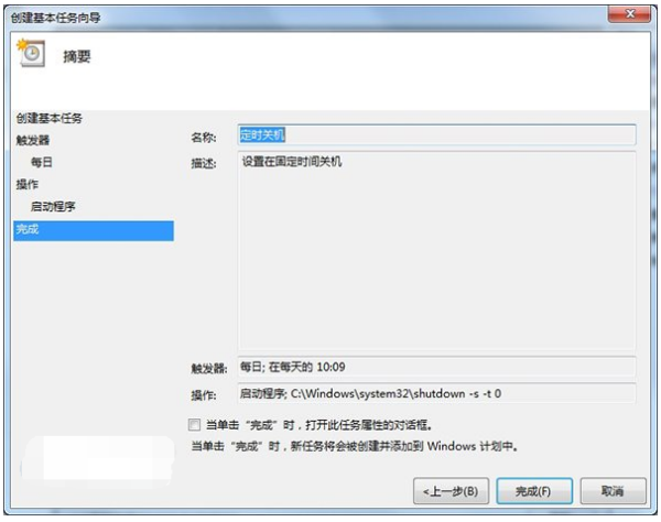 8.看一下大致的内容,没问题的话点击“完成”,我们的系统就会在设定的时间完成关机。