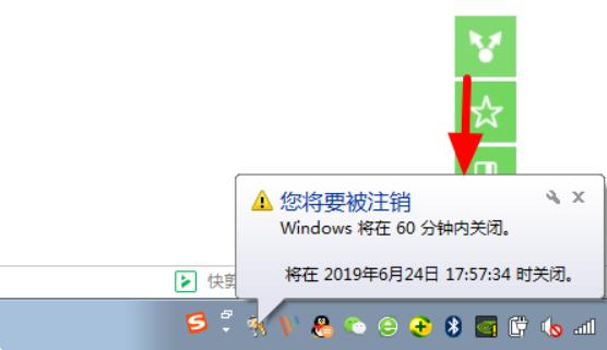 3、然后在电脑右下角就会弹出一个提示窗口,提示电脑将在一小时后关机。