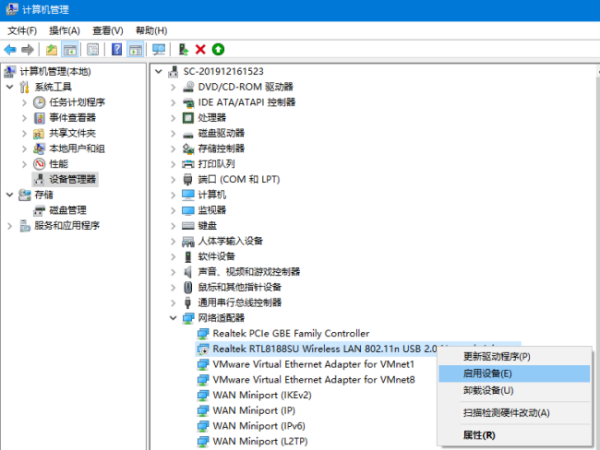 右击桌面上的“计算机”,点击“管理”-“设备管理器”,展开“网络适配器”,右击被禁止的无线网卡,点击“启用设备”,确定即可。