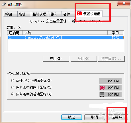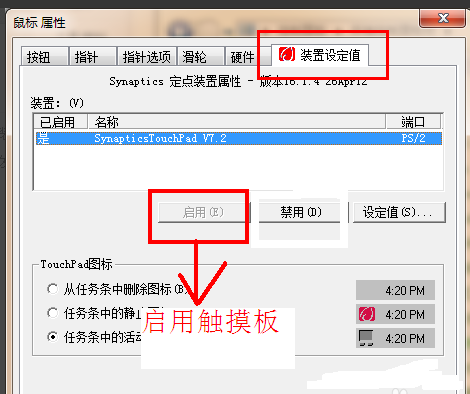 在打开的鼠标属性中有一个装置设定值选项,选定装置设定值栏目下,发现有触摸板,进行启用。