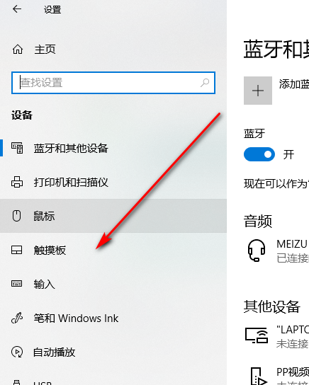 4、接下来在设备界面选择左侧菜单栏的“触摸板”选项;