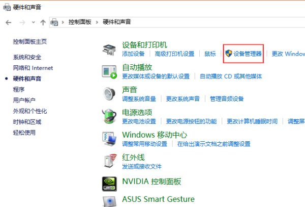 三、选择“硬件和声音”界面的“设备管理器”点击进入。