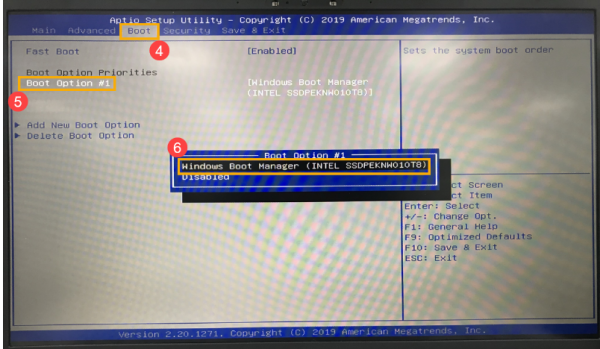 3. 确认开机硬盘是否正确。进入[Boot]页面④,选择[Boot Option #1]⑤并确认是否正确[选择您笔记本电脑的操作系统所使用的硬盘]⑥。
