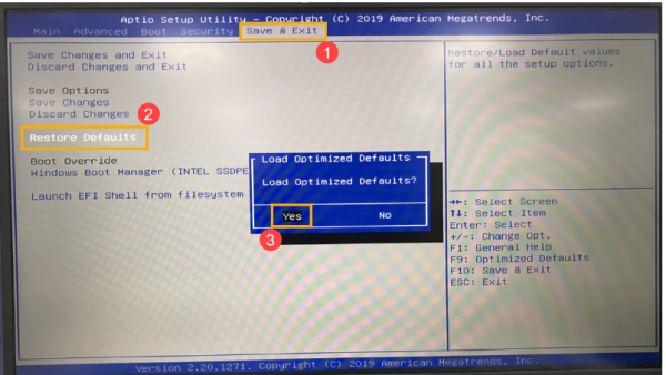 2. 进行BIOS设定还原。进入[Save & Exit]页面①, 选择[Restore Defaults]②后并选择[Yes]③。