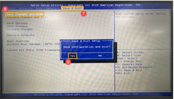 4.储存设定并离开。进入[Save & Exit]页面⑦,选择[Save Changes and Exit]⑧后并选择[Yes]⑨。