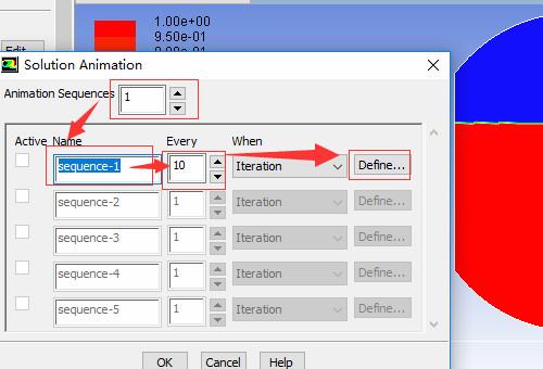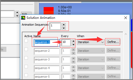 3、在其界面中设置动画序列数,动画名字,多少迭代步数保存一次。如下图,我这里的动画序列数为,动画名字sequence-1,每迭代10步保存一次。在点击“Define”。