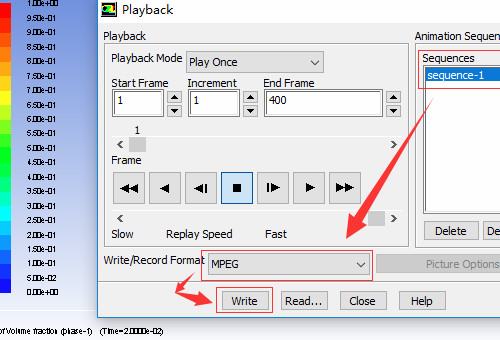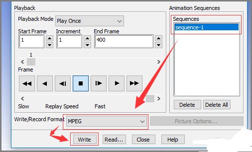 8、在Suquences栏中选中“sequence-1”,Write/Recrod Format栏中选择“MPEG” ,再点击“Write”。写出视频文件。