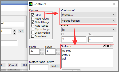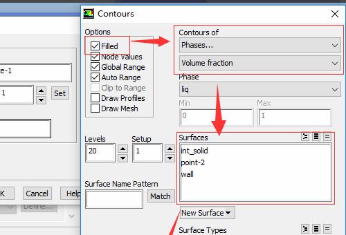 5、在“Contours”界面选择栏中,勾上“Filled”。在选择需要什么样物理参数的轮廓图(这里小编选择的是相)。如果是二维模型,surfaces那栏就不用选了。如果是三维的话,需要选择一个面,点击“Dispaly”。