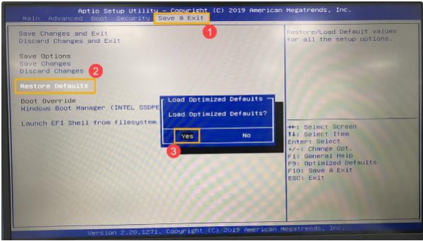 进入[Save & Exit]页面(1), 选择[Restore Defaults](2)后并选择[Yes](3)。