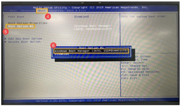 进入[Boot]页面(4),选择[Boot Option #1](5)并确认是否正确[选择您笔记本电脑的操作系统所使用的硬盘](6)。