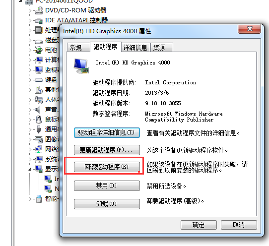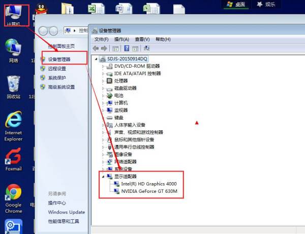 在桌面上选择“计算机”右击,依次点击“属性”>“设备管理器”>"显示适配器">"具体显卡",双击需要回滚驱动的显卡。