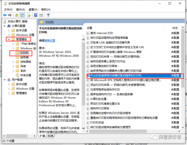 2、点击 计算机配置——管理模板——打印机,双击“不允许安装使用内核模式驱动程序的打印机”,设为“己禁用”。