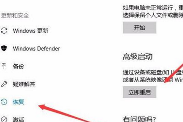 3、在新打开页面中点击左侧边栏的“恢复”菜单项,然后在右侧新打开的页面中选择“立即重启”按钮。