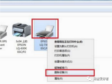2、在设备和打印机的窗口中,选择要卸载的打印机右击,在弹出的菜单中选择删除设备。