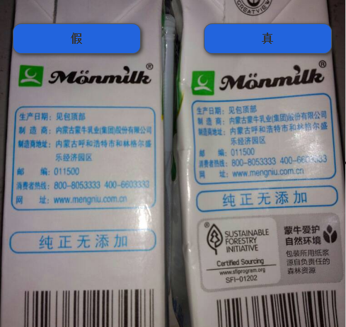 1、正品蒙牛牛奶包装盒封口上的文字清晰有力。而假的蒙牛牛奶正面包装盒印刷的字迹不知如何辨认。