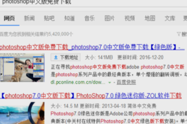 1、在百度上搜索你要下载的软件;这里以“photoshop”为例。