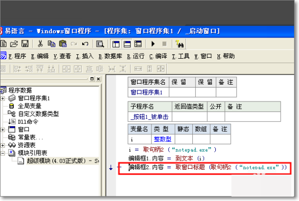 6.双击button1,在子例程“_button1_isclicked”下新建一个名为“I”的整数变量,然后编写如下代码:I=takehandle2(“记事本”)。编辑框1。Content=对文本的回答(I)。