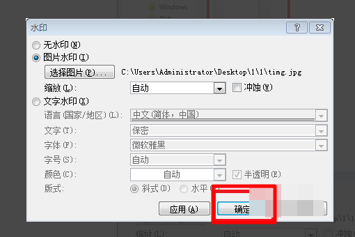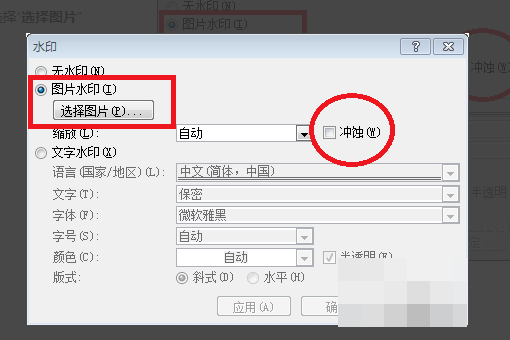 2、在水印提示窗中选择“图片水印”,然后不选中“冲蚀”。然后选择“选择图片”。