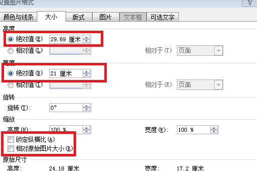 6、在设置图片格式对话框选择大小,去掉锁定纵横比和相对于原始图片大小框中的勾,在高度输入框中输入29.69厘米,在宽度输入框中输入21厘米;然后退出页眉编辑模式,就可以了。