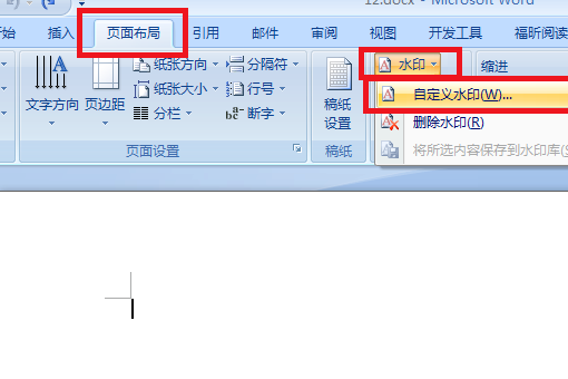 1、点击菜单栏中的“页面布局——水印——自定义水印”。