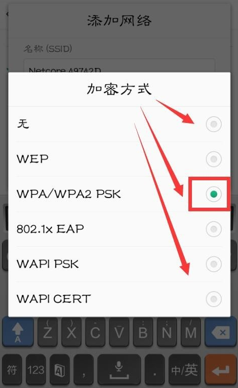 5.记得要选择正确的加密方式,一般我们的加密方式是选择WPA/WPA2 PSK这个选项,点击链接就可以链接上WIFI了。