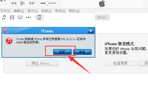 5、之后将苹果手机连接电脑。在电脑iTunes操作界面就会提示有一台处于恢复模式的iPhone时,按一下shift,选择下载好的固件进行恢复;