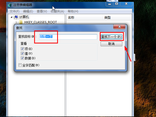 4、然后在出现的对话框中,输入“百度一下”进行查找。