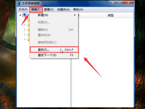 3、在注册表编辑器的编辑菜单中,点击“查找”选项。