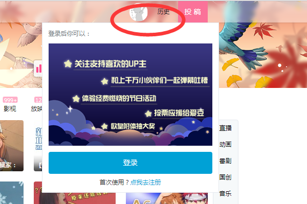 1、电脑进入哔哩哔哩网站,在网页右上角登录哔哩哔哩。