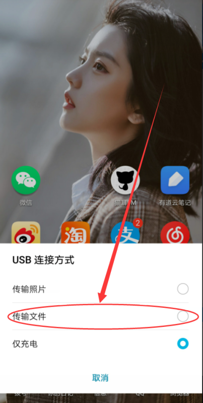 第一步:用数据线将手机和电脑连接起来,并在手机弹出的窗口中选择“传输文件”。