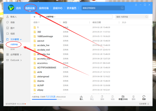 第二步:连接完成后,如果在联网状态,电脑会自动安装Hisuite(华为手机助手)。等待片刻后打开华为手机助手,先点击上方的“我的设备”,再点击左侧的“文件管理”-“内部存储”。