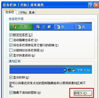 2、在任务栏属性窗口中,点击隐藏自定义图标后面的自定义按钮。