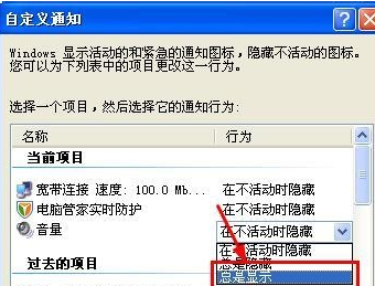 3、然后在自定义通知窗口中,选择音量的显示行为为总是显示,最后确定后电脑声音图标小喇叭就会出来了。