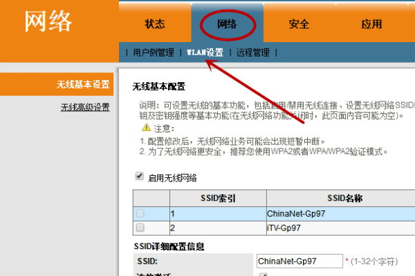 2、其次,完成上述步骤后,进入光猫,找到“网络”下的“WLAN设置”选项,如下图所示,然后进入下一步。