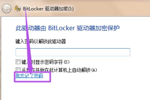 1、使用BitLocker加密了的U盘,当插入电脑打开的时候,需要输入密码,而忘记了密码,可以点击输入密码界面的“我忘记了密码”。