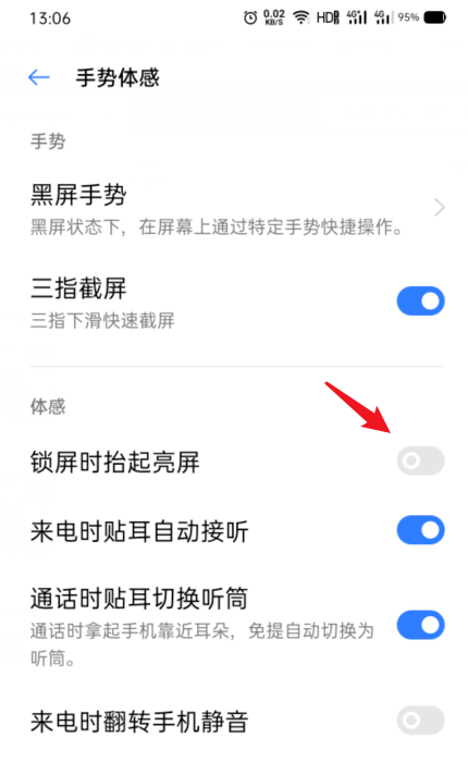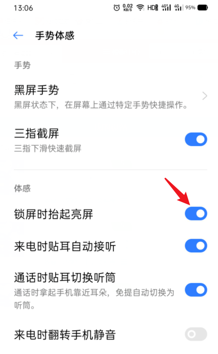 3、打开【抬起亮屏】的开关,以后再拿起手机的时候就可以自动点亮屏幕了。