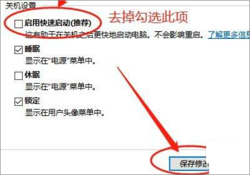 去掉勾选“启用快速启动”——点击“保存修改”,重启电脑即可。详细步骤: