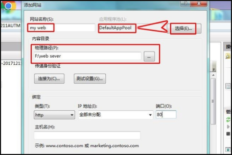 10、填写‘网站名称’;b.通过‘选择’将‘应用程序池’设为‘DefaultAppPool’;c.选择‘物理路径’(也就是你服务器的根目录);其它不用管,最后点击确定。服务器就建好了。